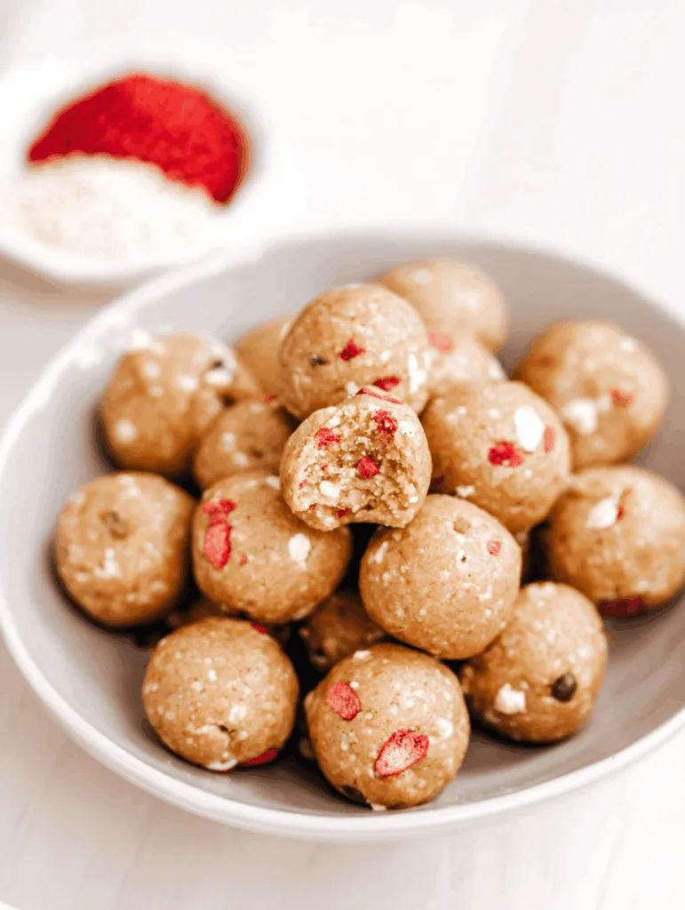 Dessert meets fitness in these fruity Power Balls Recipes. Creamy protein powder blends with crushed freeze-dried strawberries and a touch of cream cheese for that cheesecake flavor, without the sugar overload. They’re refreshing, indulgent, and ideal for anyone who believes protein snacks should taste like dessert.