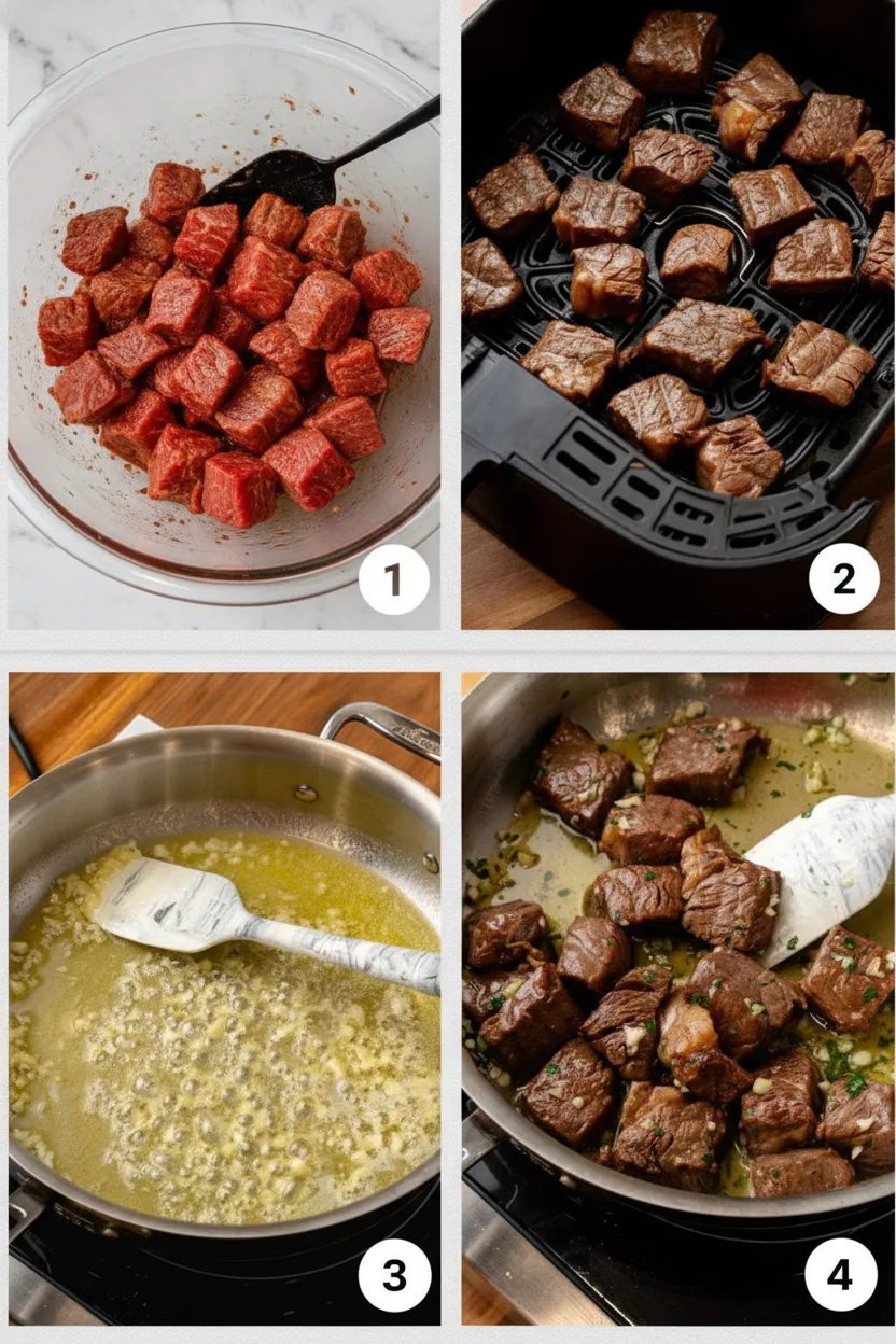 Juicy steak cubes cooked to perfection in the air fryer with a garlic butter finish