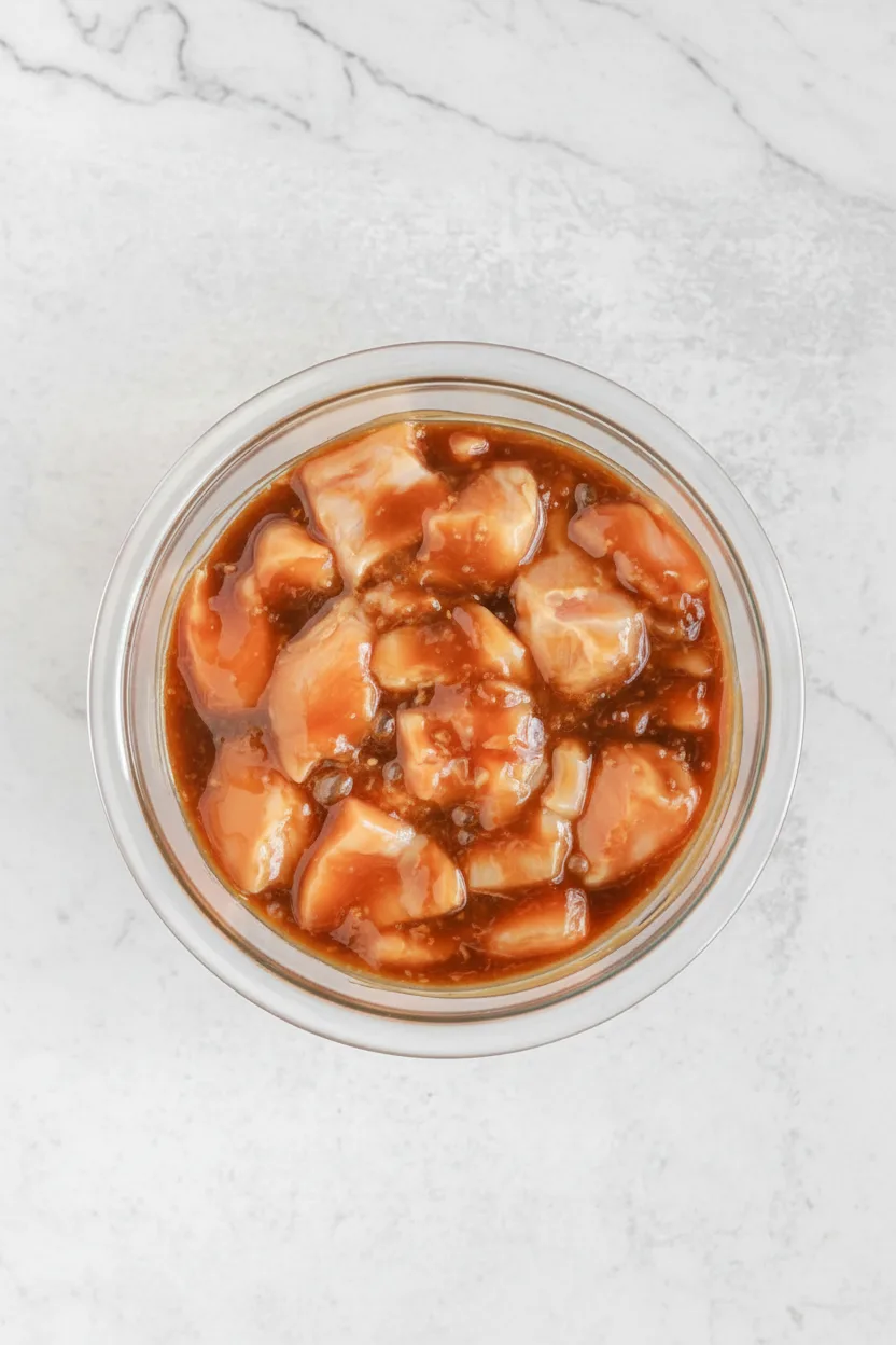 - If desired, reserve 1/4 cup of sauce to brush on the chicken after frying. Then, place chicken pieces in a large mixing bowl and pour remaining sauce over chicken. Stir chicken and teriyaki so that all pieces are fully coated.