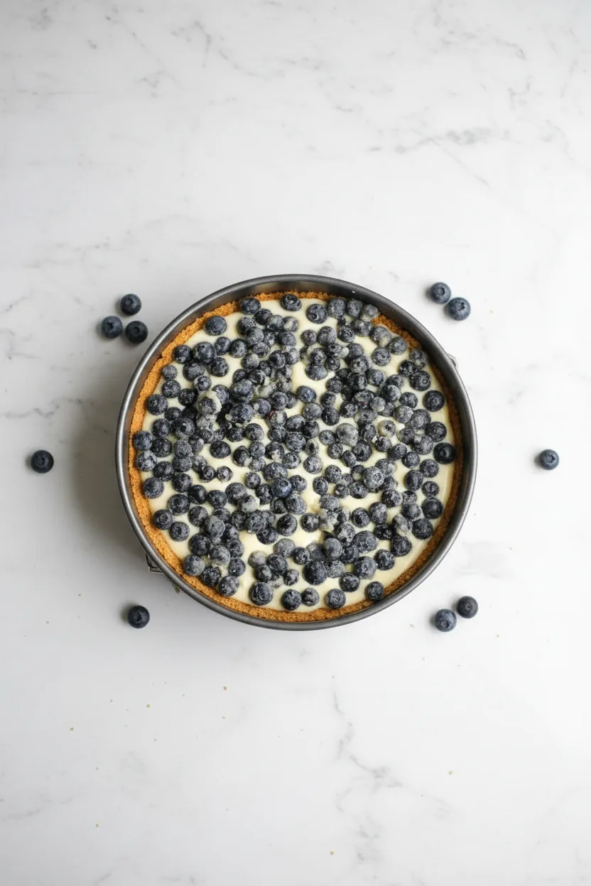 To make the blueberry mixture, simply combine the fresh blueberries, sugar, and flour in a bowl. Mix until the blueberries are evenly coated with the dry ingredients, then spoon the mixture over the cheesecake batter.