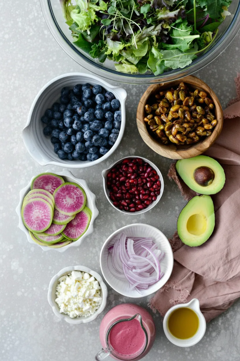 The ingredients for this salad are straightforward and easy to find. You will need spring mix salad greens, chopped butter lettuce, candied pistachios, red onion, watermelon radish, avocado, blueberries, pomegranate arils, and feta cheese.