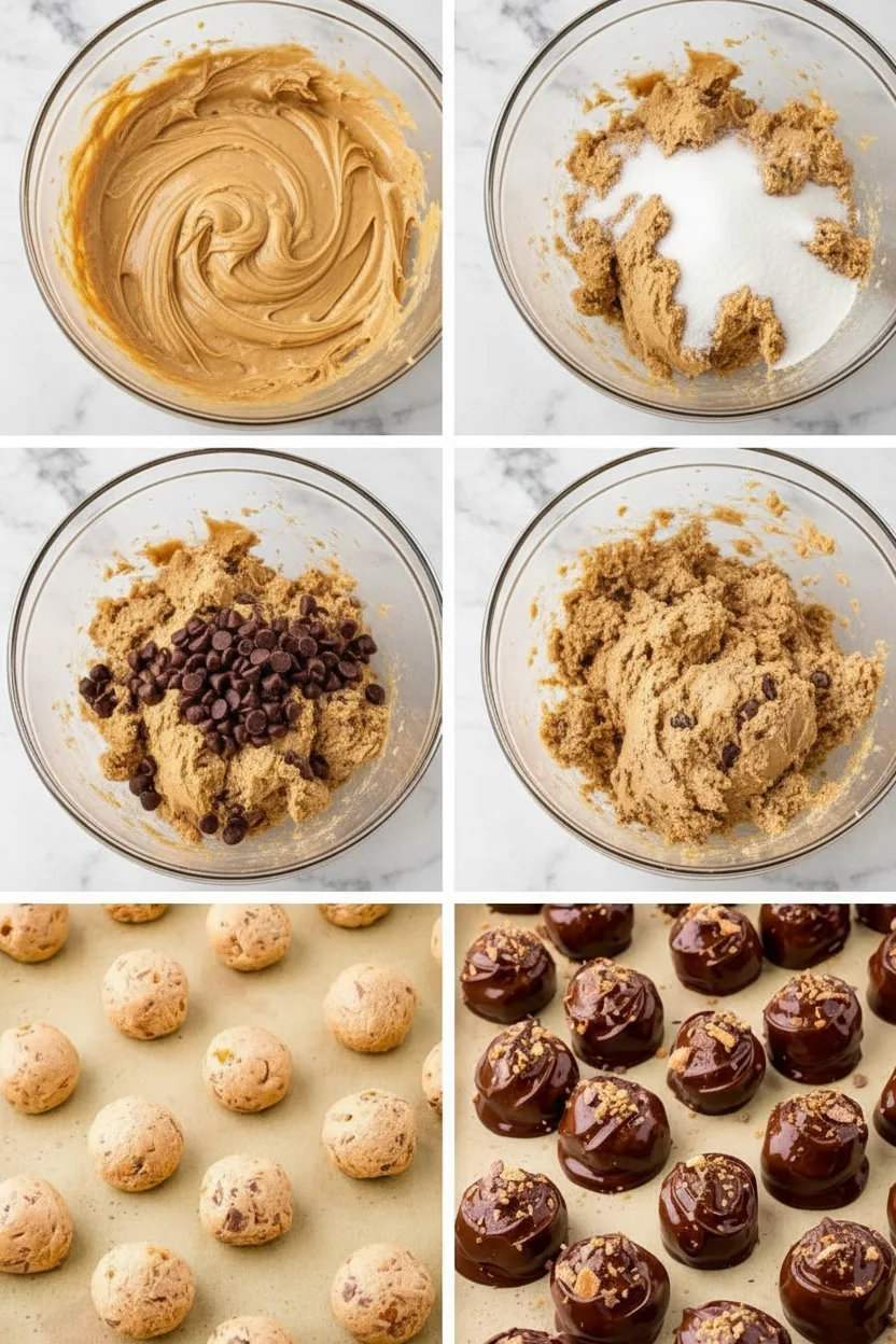 Refrigerate the dough for 30 minutes until firm enough to handle. Portion with a cookie scoop and roll into smooth balls. Freeze for 20-30 minutes to harden before dipping.