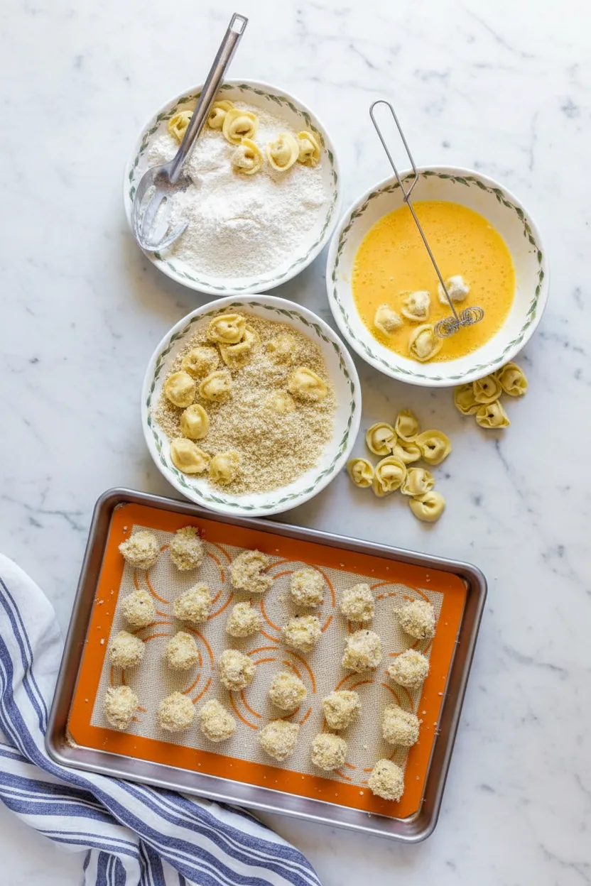Store leftovers in airtight container in refrigerator up to 3 days. Reheat in 350°F oven 5-8 minutes to recrisp. For longer storage, freeze unbaked breaded tortellini single layer on baking sheet until firm (1 hour), then transfer to freezer bags. Bake frozen tortellini 16-18 minutes at 375°F – no thawing needed!