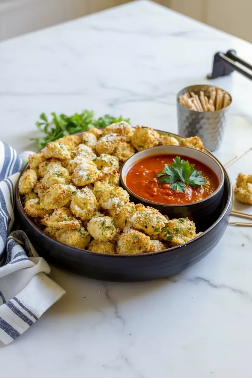 Imagine golden-brown pasta parcels filled with melty cheese, coated in seasoned breadcrumbs, and served with warm marinara sauce for dipping.