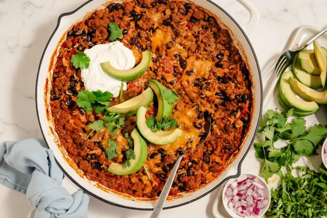 A quick and cheesy taco skillet with ground beef, black beans, and rice, topped with melted cheddar and your favorite taco toppings.