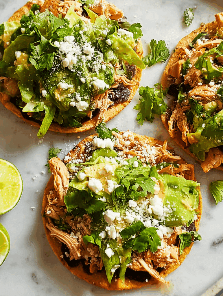 Crispy tostada shells topped with seasoned beans, juicy shredded chicken, crisp romaine, creamy avocado, and crumbled cheese for a balanced, protein-packed meal.