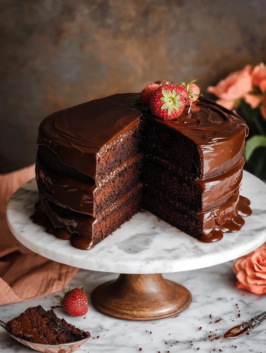 A stunning homemade layer cake featuring an ultra-moist chocolate sponge and a rich, glossy dark chocolate ganache frosting and drip.