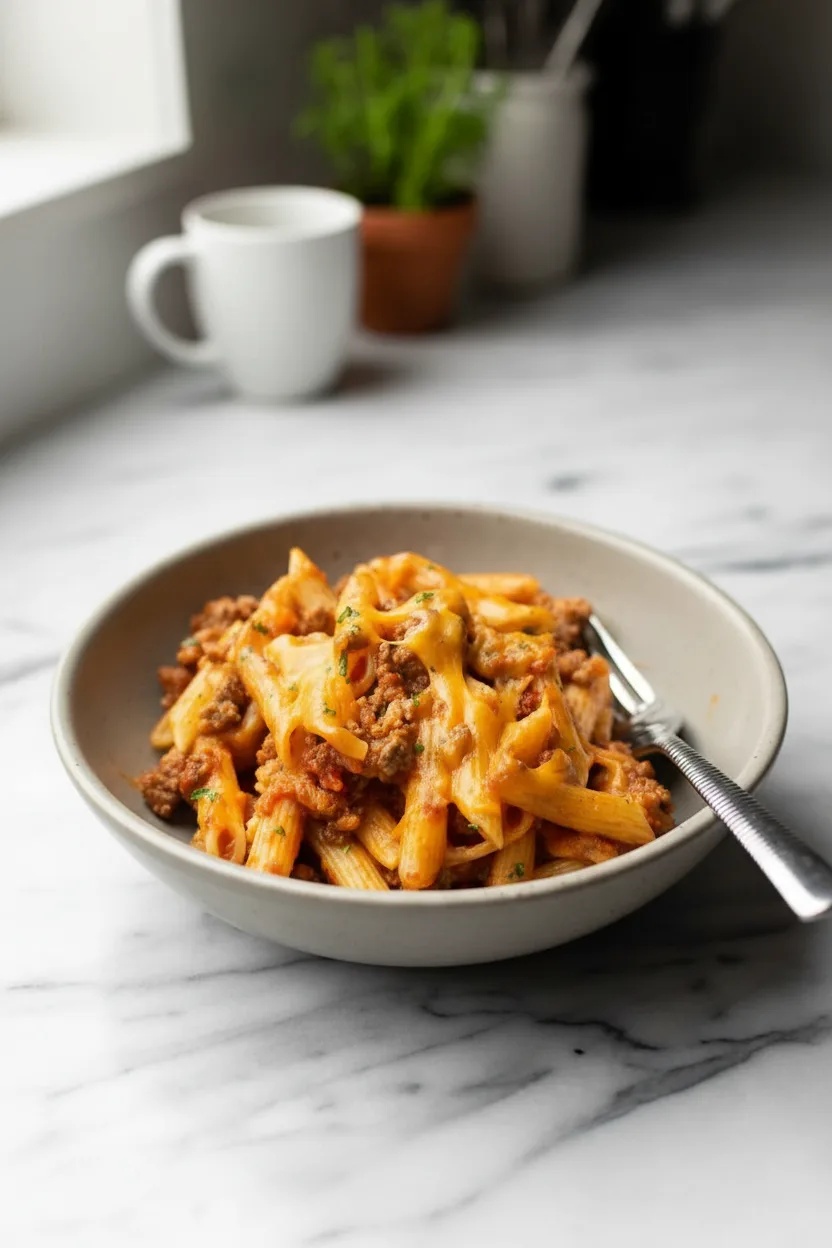 Hearty ground beef casserole with penne pasta, marinara sauce, and cheddar cheese – ready in 35 minutes!