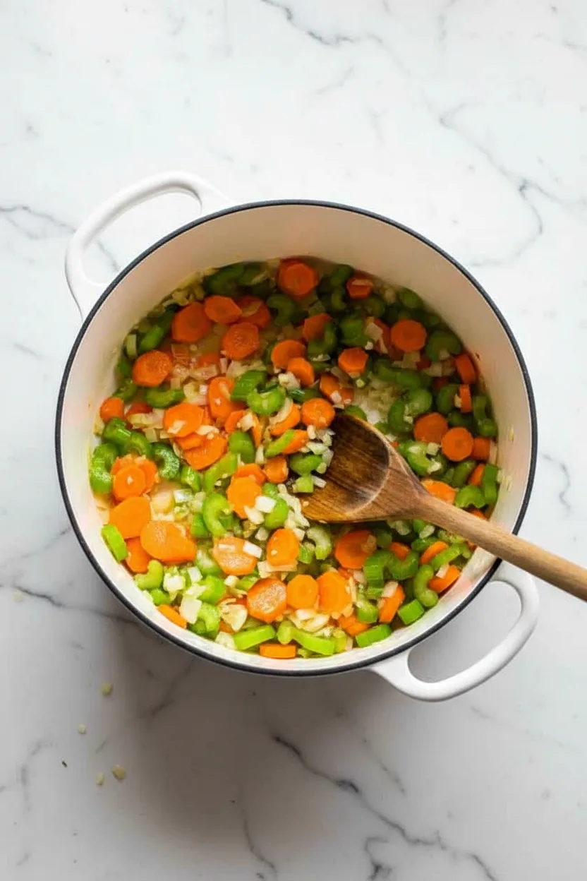 Heat olive oil and butter in a Dutch oven over medium heat. Add onions, celery, and carrots. Cook 5 minutes, stirring occasionally. Stir in garlic and cook 20 seconds until fragrant.