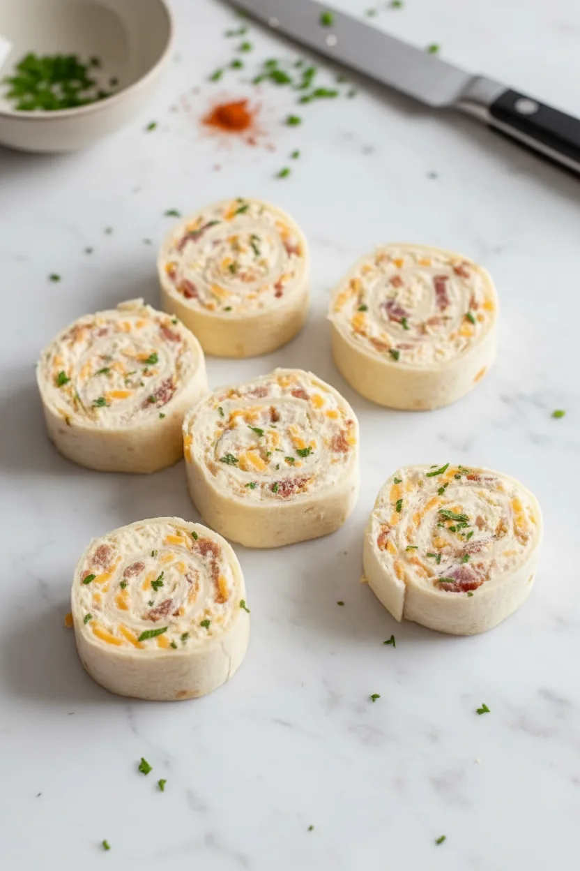 Transfer rolled tortillas to a plate or baking sheet and refrigerate for at least 30 minutes. Chilling firms the filling, making clean slicing possible. Remove from fridge and use a sharp knife to trim off uneven ends. Cut each roll into 1-inch thick rounds, wiping the blade between cuts for neat presentation.