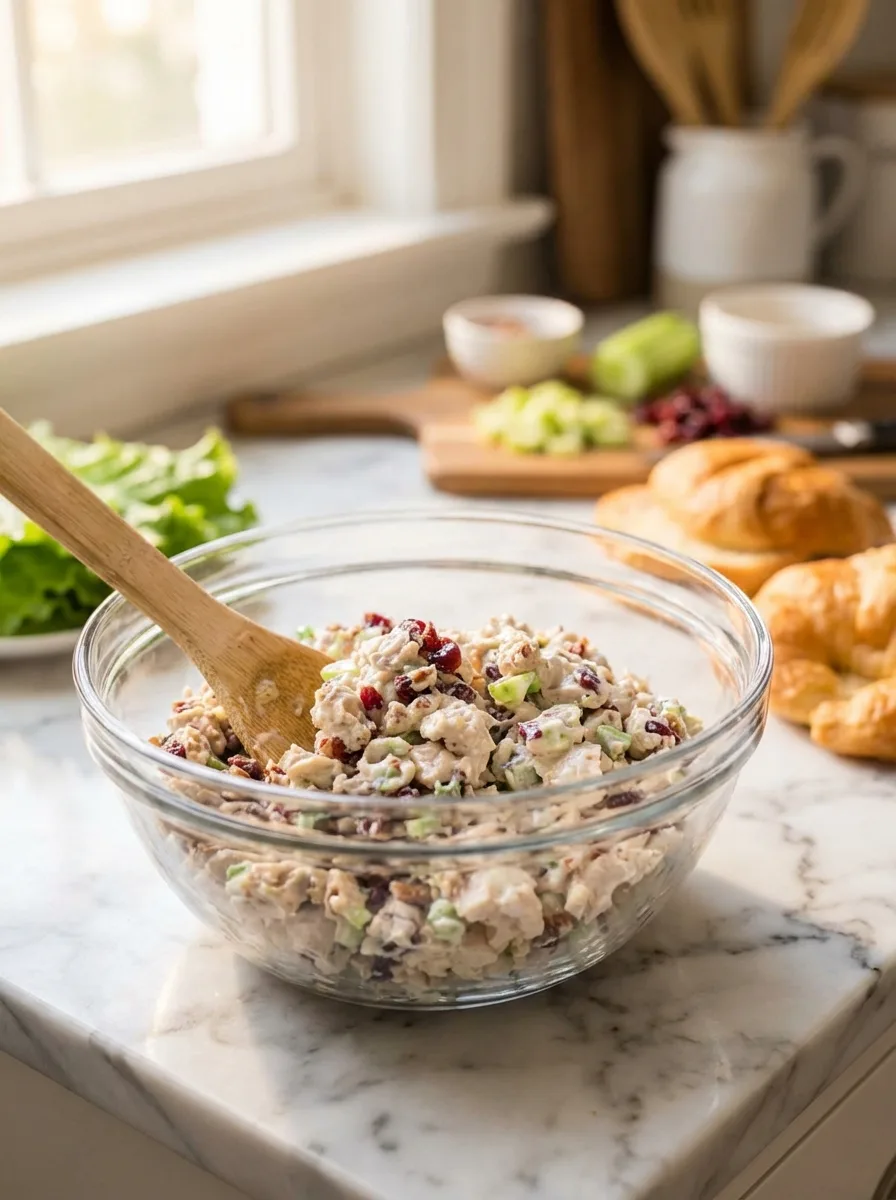 If you need to swap ingredients, try these alternatives: Use rotisserie chicken instead of home-cooked chicken for quicker prep. Swap walnuts or almonds if you don’t have pecans. Dried cherries work well if cranberries aren’t available. Greek yogurt can replace half the mayonnaise for a lighter dressing.