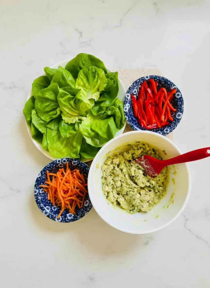 To make this recipe you will need the following ingredients 1 medium ripe avocado pitted and diced 3 tablespoons light mayo 2 tablespoons lemon juice 2 tablespoons chopped fresh basil 2 tablespoons minced red onion optional 1/2 teaspoon garlic powder optional 2 cups cubed or shredded cooked chicken salt and pepper to taste 8-10 butter lettuce leaves and minced red pepper and carrot for garnish optional