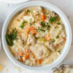 Bring warmth to your table with this comforting creamy chicken and rice soup. Combining tender chicken with aromatic vegetables and fluffy rice, this dish delivers rich flavors in every spoonful.