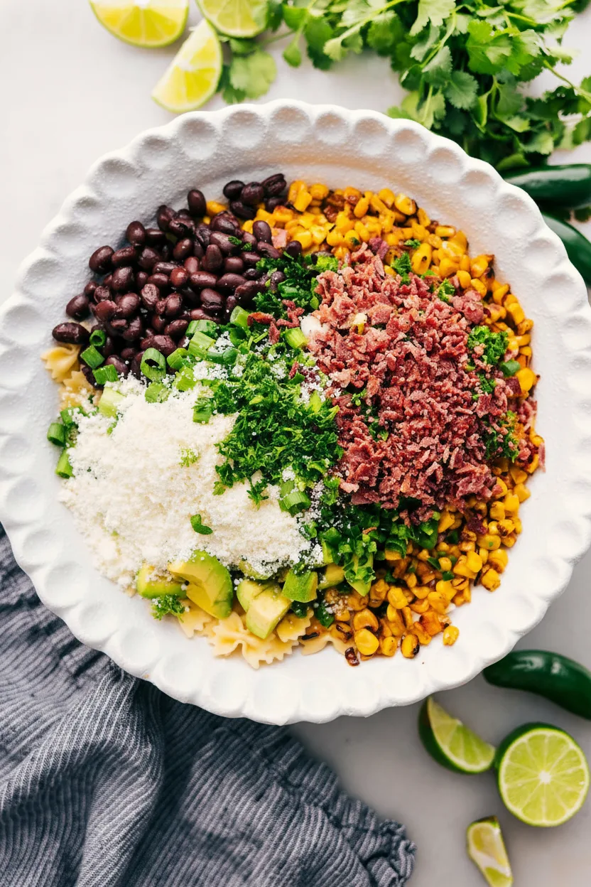 - Combine cooled pasta, cooled corn, diced avocado, diced green onions, diced cilantro, diced jalapeño, diced turkey bacon, and cotija cheese in a large bowl