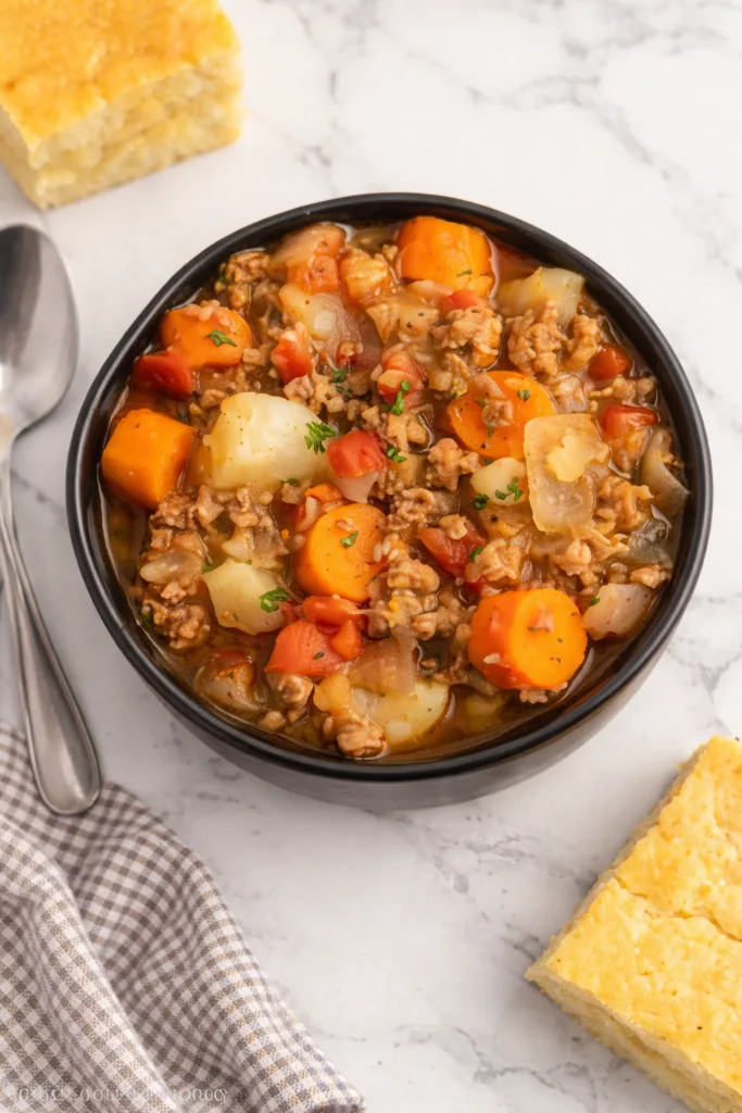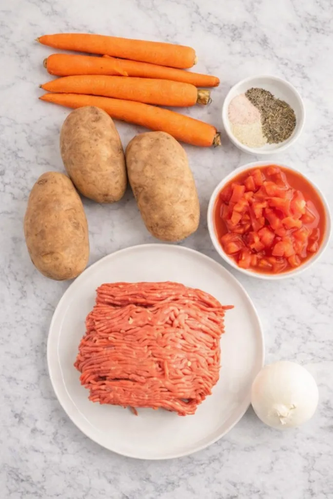 Peel and dice the potatoes into 1-inch chunks. Slice carrots into thick rounds to prevent overcooking. Dice onions uniformly so they soften evenly. Browning the beef beforehand creates better flavor and reduces grease.