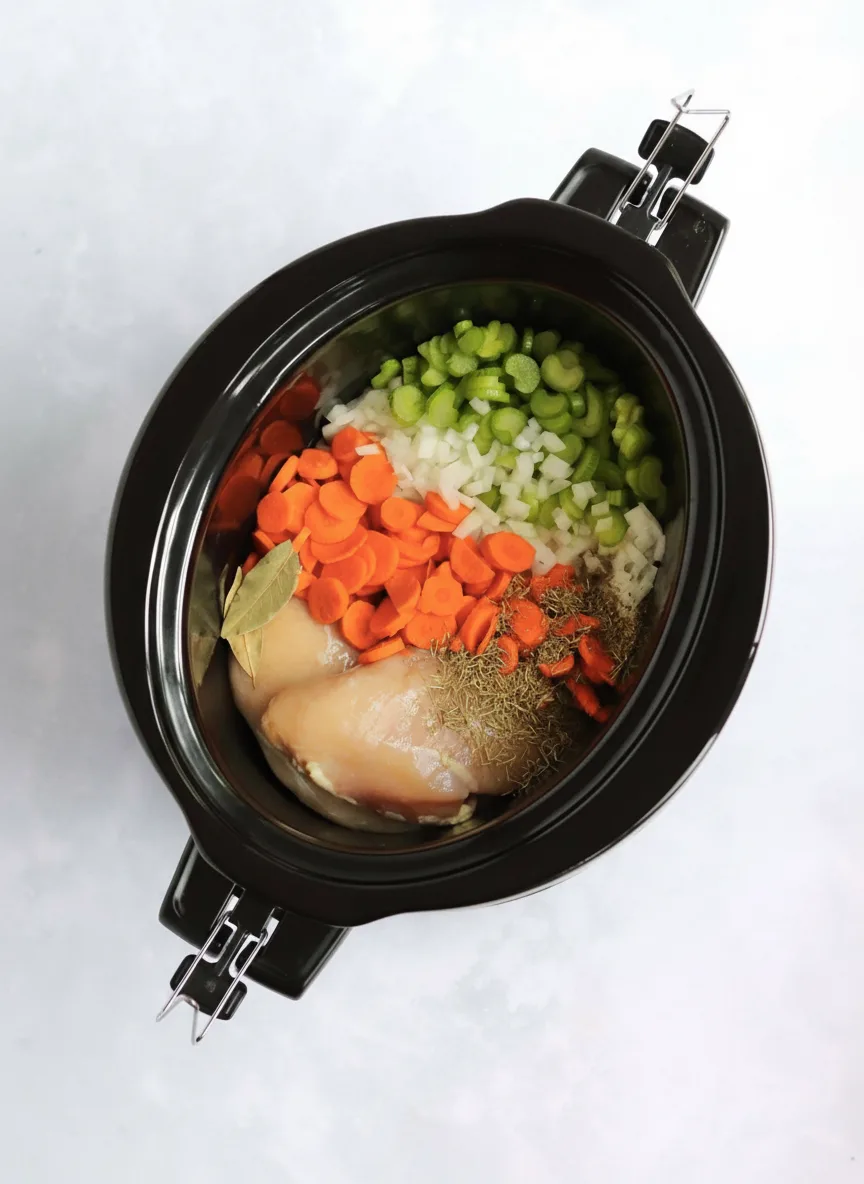 In your crockpot, combine diced onion, sliced carrots, celery, minced garlic, chicken stock, chicken breasts, bay leaves, thyme, rosemary, salt, and pepper. Stir gently to distribute ingredients evenly throughout the broth. Cover with the lid and cook on low for 6-8 hours.