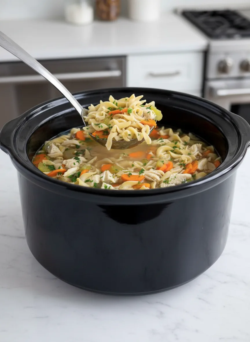 A comforting and easy slow cooker chicken noodle soup with tender vegetables and perfectly cooked noodles.