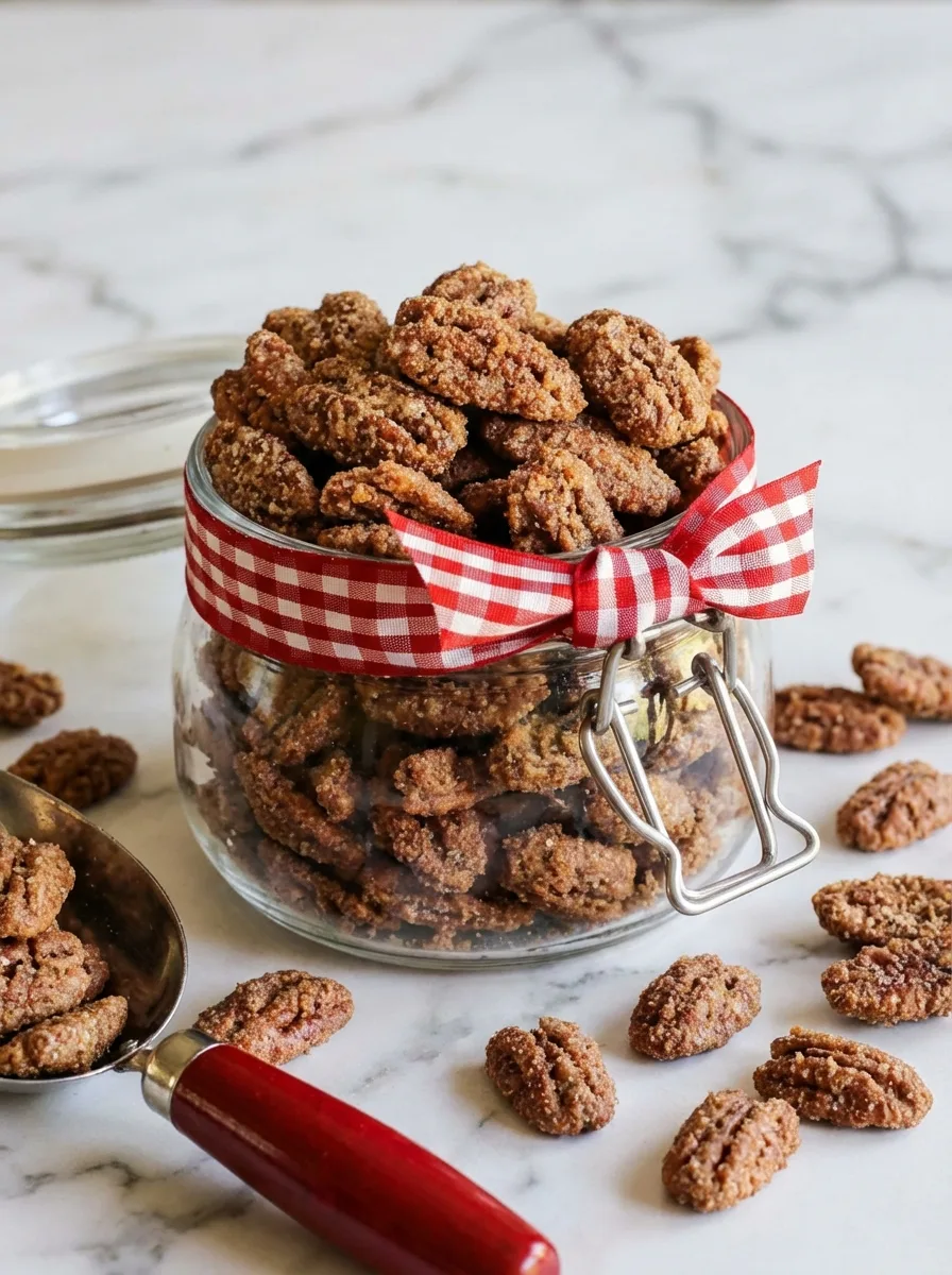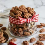 Sweet and spicy candied pecans with crispy caramel coating – perfect for snacks, salads, and holiday gifts!