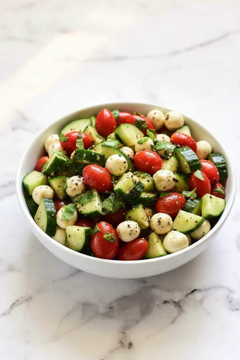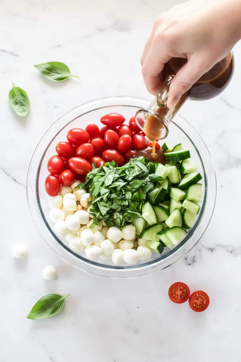 A refreshing and healthy salad made with cucumber, mozzarella, and tomatoes, dressed with balsamic vinaigrette