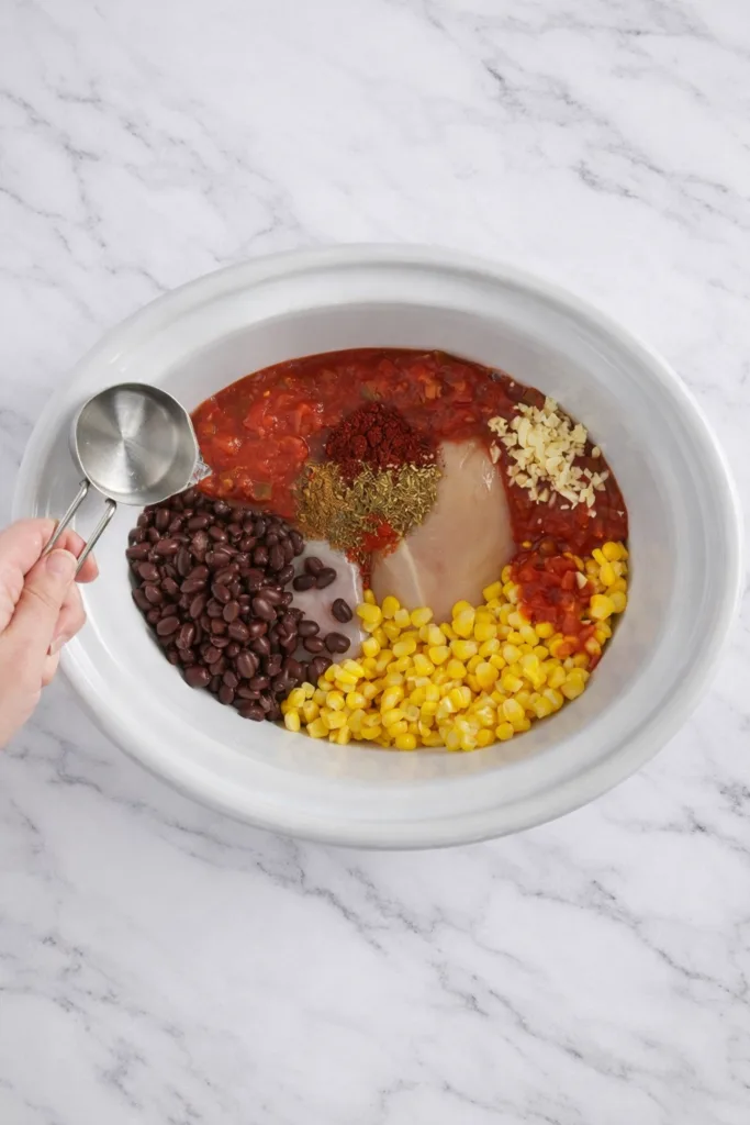 2. Add drained black beans, salsa, corn, water, garlic, and all spices to slow cooker.