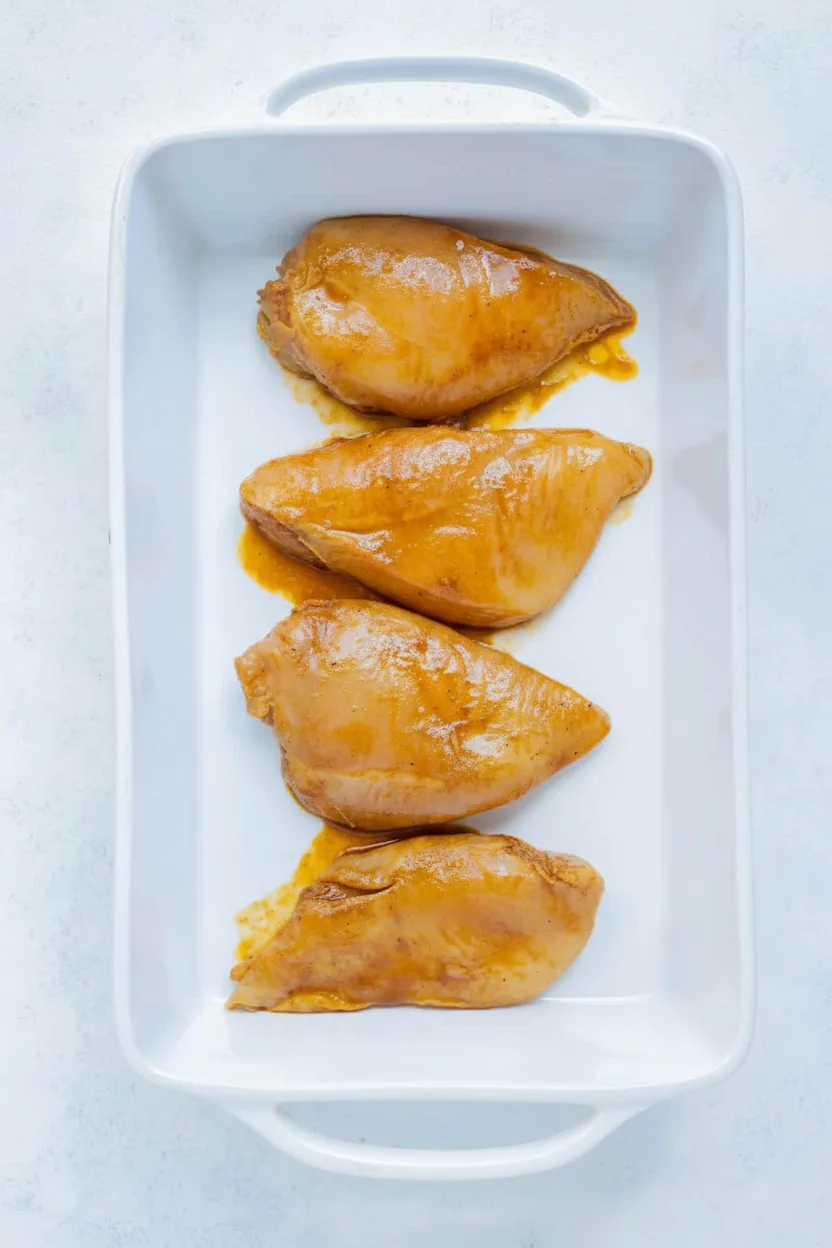 - Remove the chicken from the marinade and place in a 13 x 9-inch baking dish