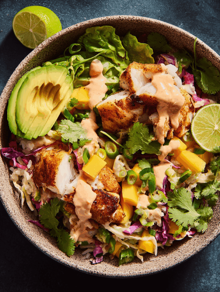 This is the fun part. You’ve got your crispy fish, your zesty slaw, and your spicy crema—now it’s time to layer it all into one irresistible bowl that’s bursting with color, texture, and flavor.