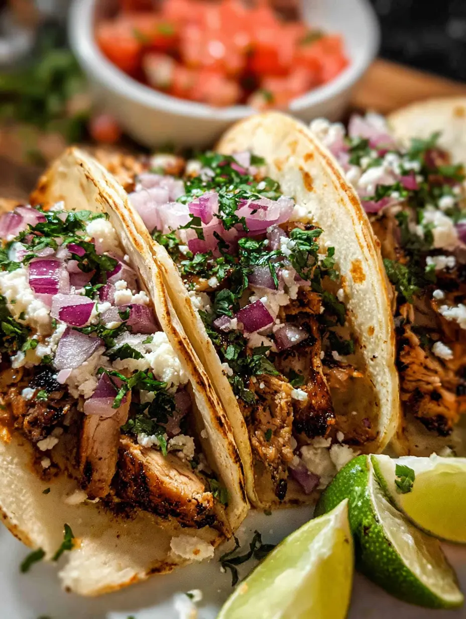 Juicy chicken marinated in a zesty garlic lime sauce, baked to perfection, and served in warm tortillas with fresh toppings for an unforgettable taco night.