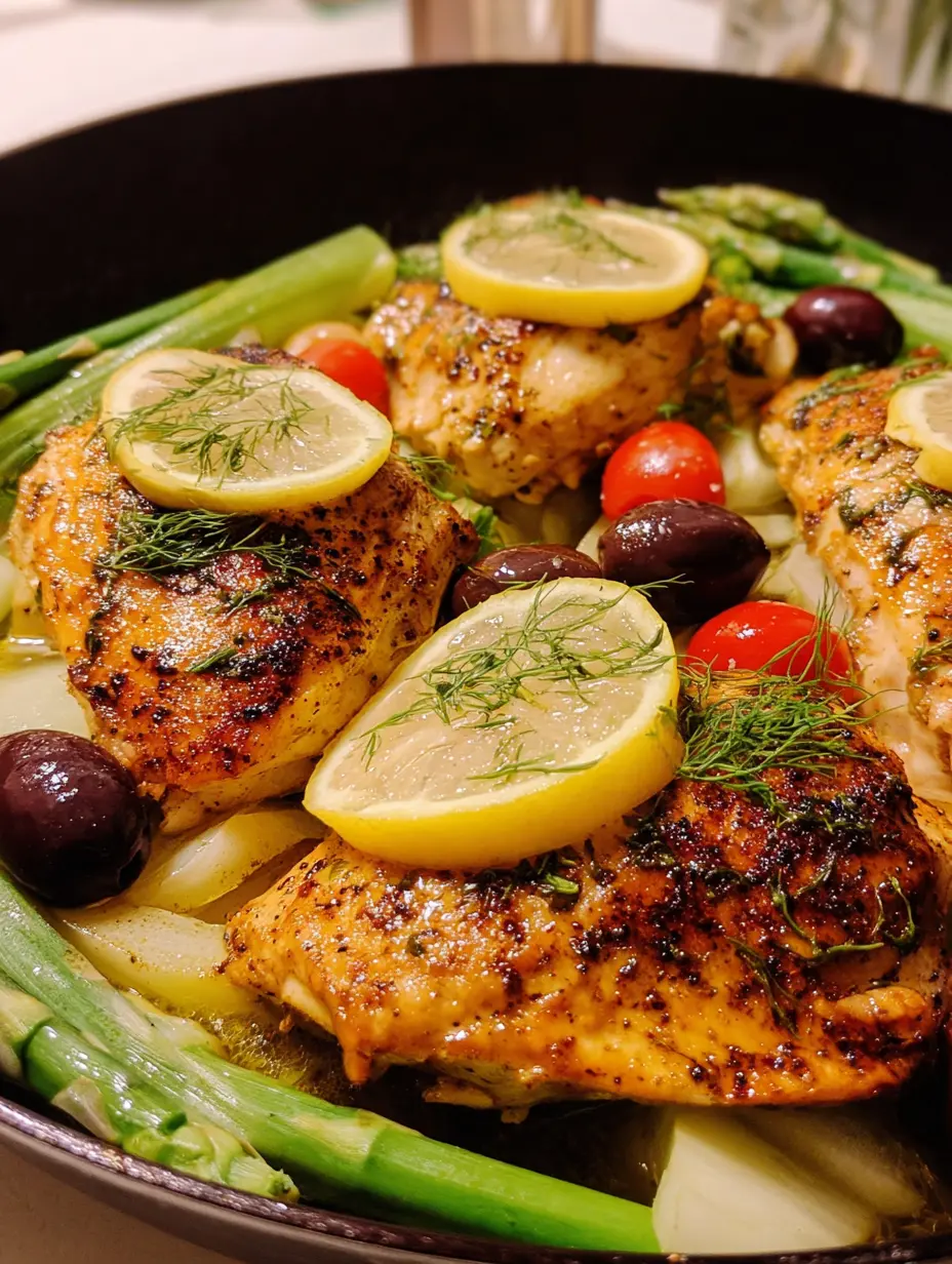 A vibrant one-pan baked Greek chicken dinner with lemon, garlic, oregano, asparagus, and zucchini. An easy, healthy weeknight meal bursting with Mediterranean flavor.