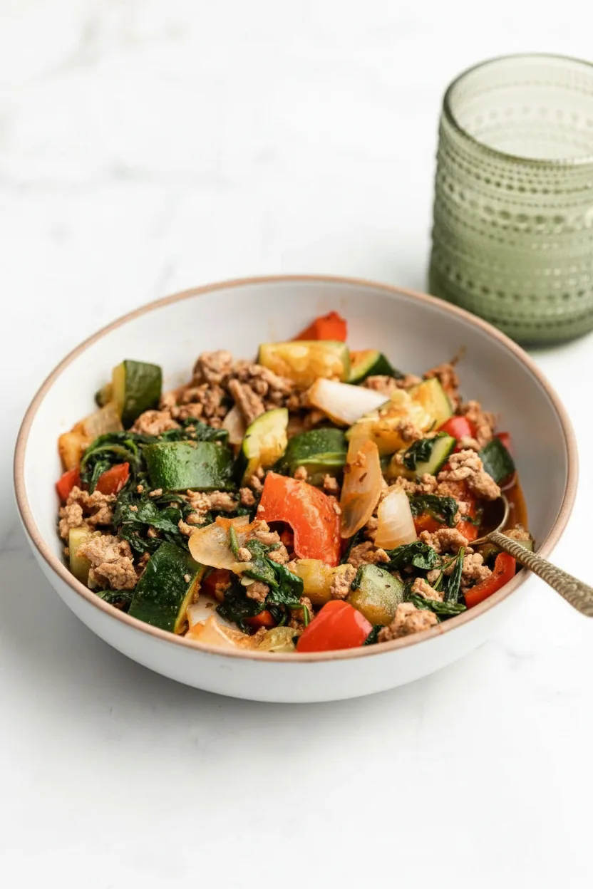 Lean ground turkey provides 25 grams of protein per serving without excess saturated fat. Zucchini adds fiber and vitamins A and C, blending perfectly with nutrient-rich spinach and bell peppers.