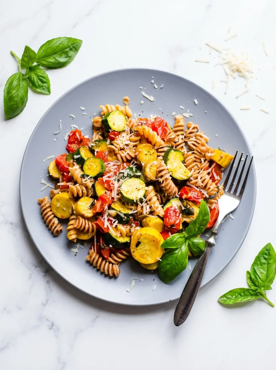 A vibrant 20-minute pasta loaded with fresh zucchini, juicy tomatoes, and savory garlic. Perfect as a light main course or hearty side dish.