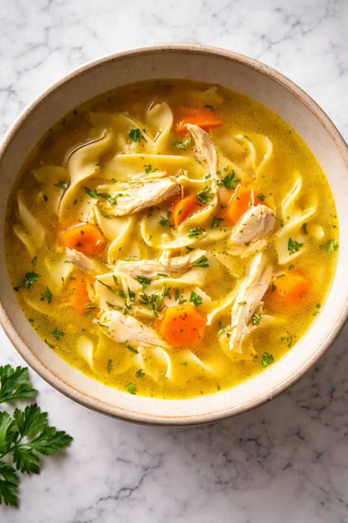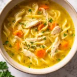 Classic comforting chicken noodle soup made from scratch with tender chicken, vegetables, and egg noodles in a savory broth.