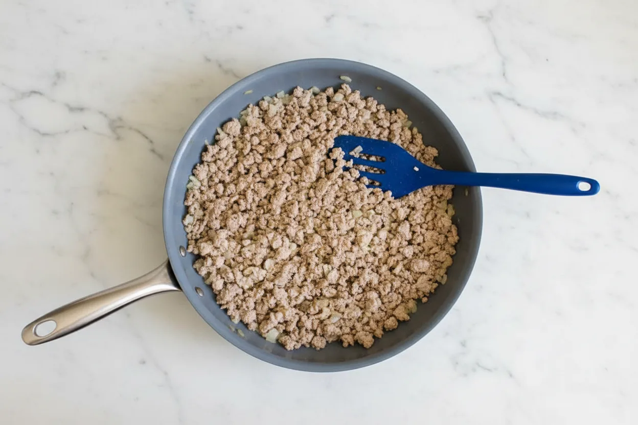 Add ground turkey to the pan and break it apart with a wooden spoon. Cook 5-7 minutes until no pink remains and meat develops golden brown spots. Constant stirring prevents sticking and ensures even cooking.