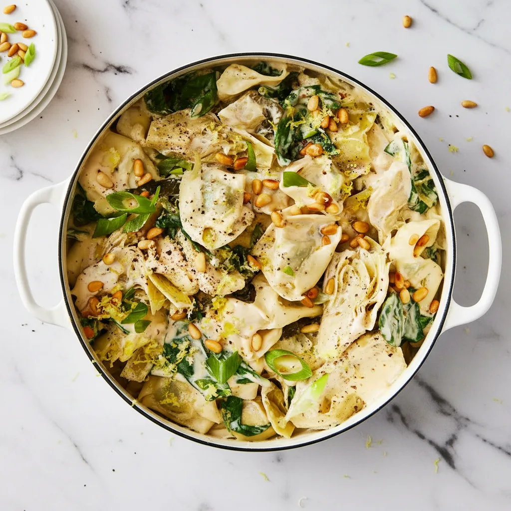 Using pre-made cheese tortellini is a fantastic time-saver, providing a hearty protein and carbohydrate base. The baby kale and spinach wilt quickly, adding color, nutrients, and a slight earthy note that balances the rich sauce. Marinated artichokes contribute a tangy, briny depth that elevates the entire dish beyond a simple pasta. The final flourish of toasted pine nuts and lemon zest adds essential crunch and brightness, cutting through the creaminess perfectly.