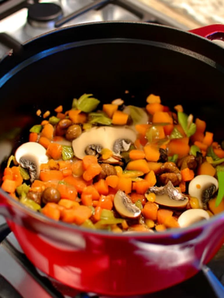 - Heat a large soup pot over medium-high heat and melt butter. Add carrots, mushrooms, celery, and shallot. Sauté until the mushrooms release their liquid and it evaporates, about 3–4 minutes.