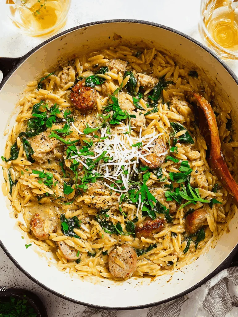 Start with chicken sausage it’s lean, flavorful, and browns beautifully in a skillet. Combined with onion and garlic, it builds a deep, savory base. Then comes orzo, that little rice-shaped pasta that soaks up broth like a sponge. Each grain turns silky and tender without losing texture.