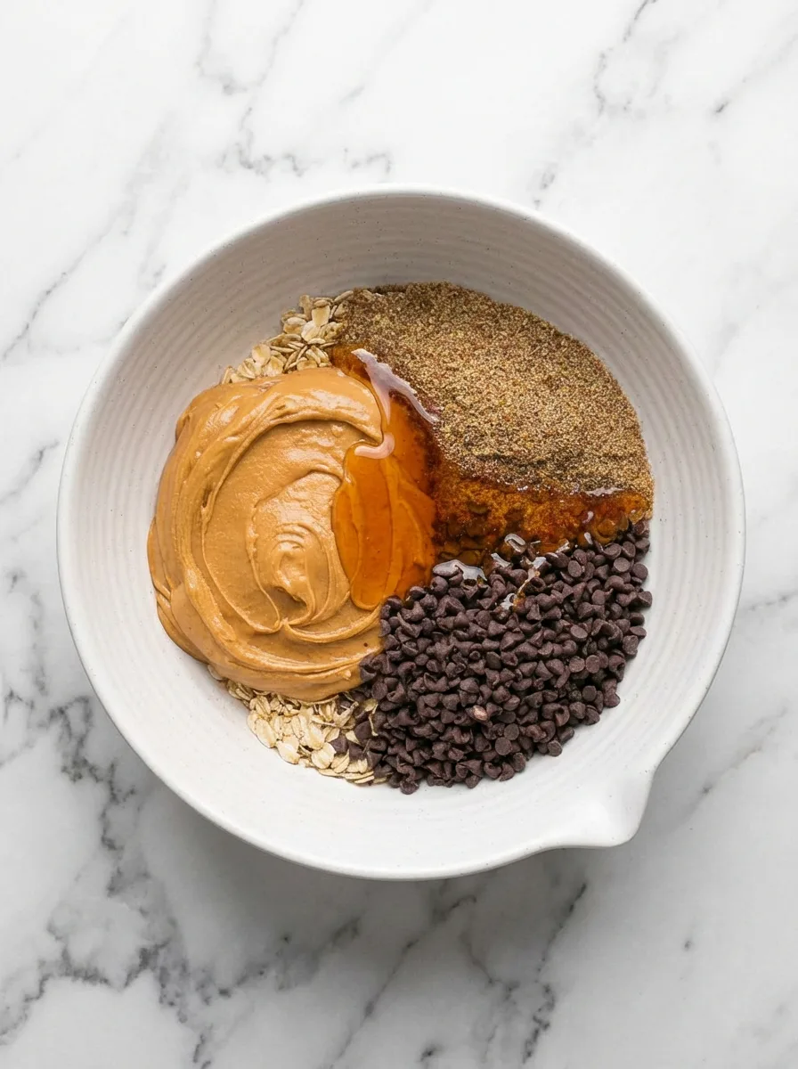 - Combine the oats, peanut butter, chocolate chips, flaxseed, and honey in a medium bowl.