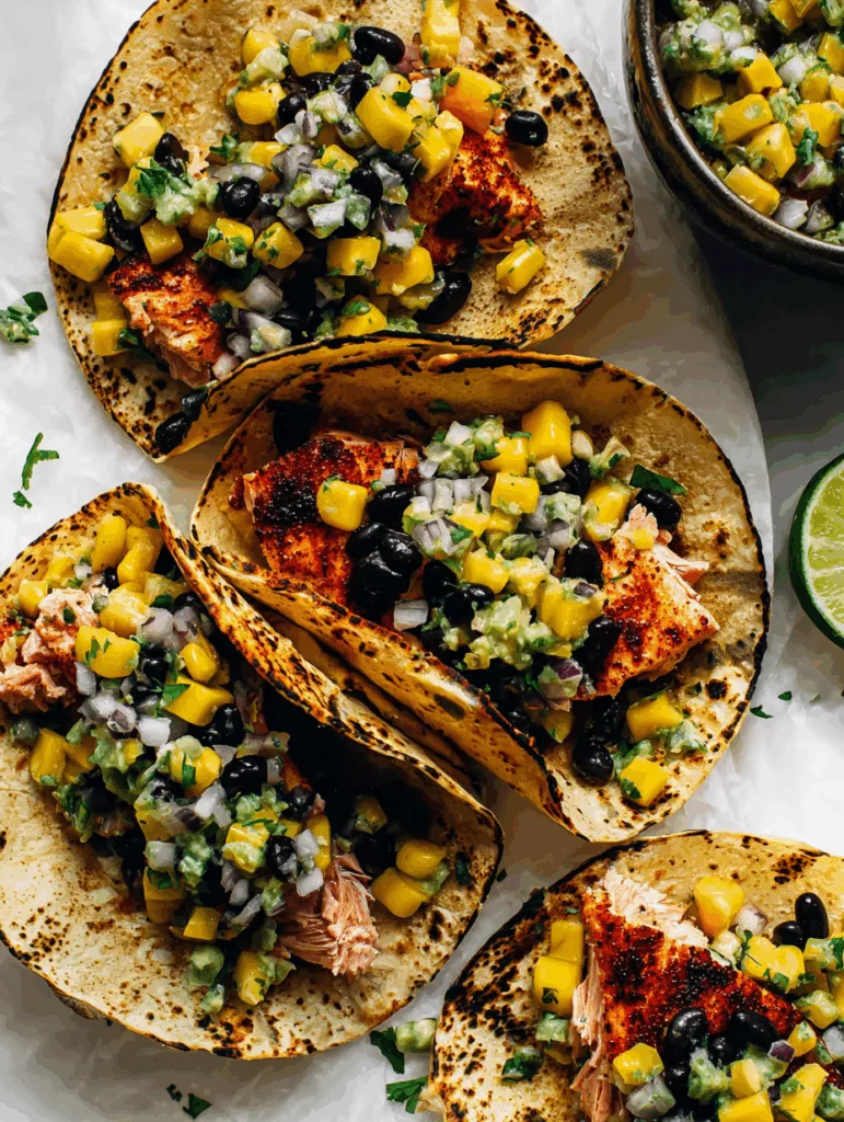 Every component in these tacos pulls its weight. The salmon is lightly seasoned and roasted or grilled until it flakes apart with a fork. The salsa adds pops of sweetness from mango, crunch from corn, and a little heat from jalapeño. Add a dollop of creamy yogurt-lime sauce, and you’ve got layers of flavor that make each bite unforgettable.
