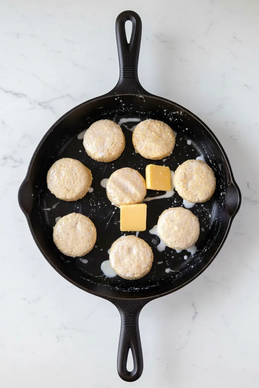 Brush the tops of all the biscuits lightly with a bit of milk. Then, take about 2 tablespoons of cold butter and cut it into small pieces. Scatter these butter pieces around the biscuits in the skillet. Bake for 20 to 22 minutes. The biscuits will be puffed high and golden brown on top.