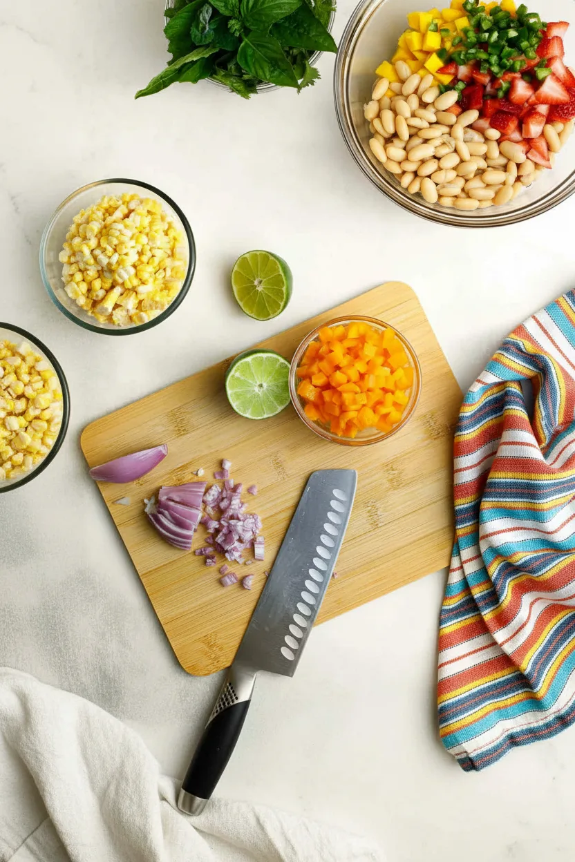 To prepare this recipe, start by combining the diced mango, strawberries, red bell pepper, and corn kernels in a bowl. Next, whisk together the dressing ingredients, except for the olive oil, in a separate bowl. Then, add the olive oil in a steady stream, whisking vigorously until it’s fully incorporated. After that, add the dressing to the bowl with the base ingredients and toss to combine. Finally, taste and adjust the flavor as needed, adding more salt, lime juice, or honey to taste.