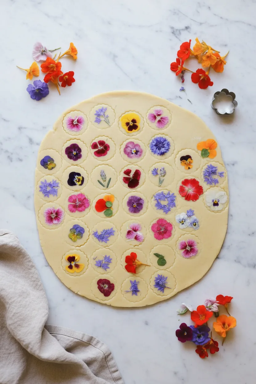 To make these delicious cookies, you’ll need the following ingredients: 1 1/2 cups (3 sticks/339 g) unsalted butter, at room temperature, 1 1/3 cups (300 g) granulated sugar, 2 teaspoons kosher salt, 3 large egg yolks, 2 tablespoons (25 g) pure vanilla extract, 4 cups (611 g) all-purpose flour, and 2 cups mixed edible flower petals and tender herbs.