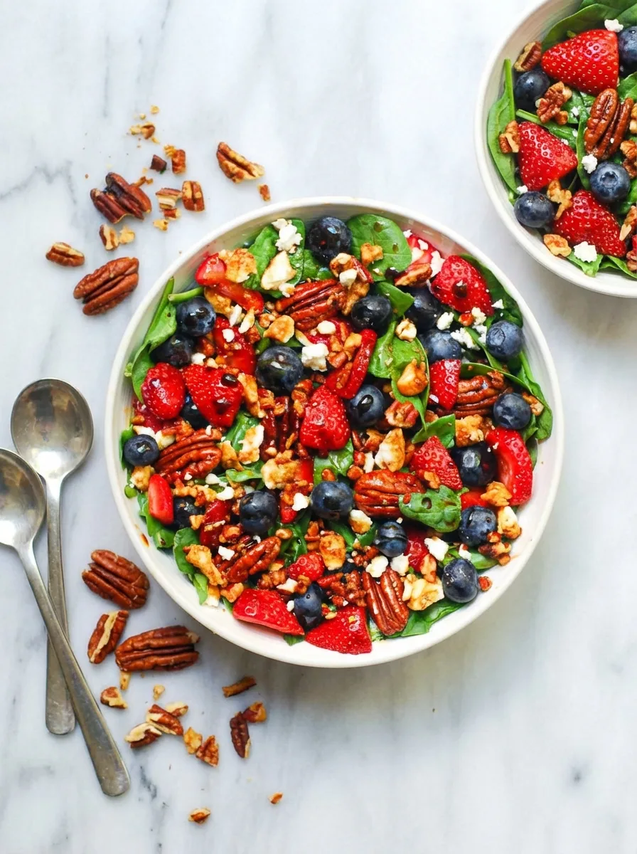 A refreshing mix of sweet berries and fresh spinach tossed with tangy feta and crunchy pecans.