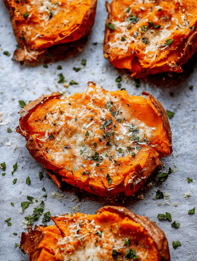 Garlic Butter Smashed Sweet Potatoes