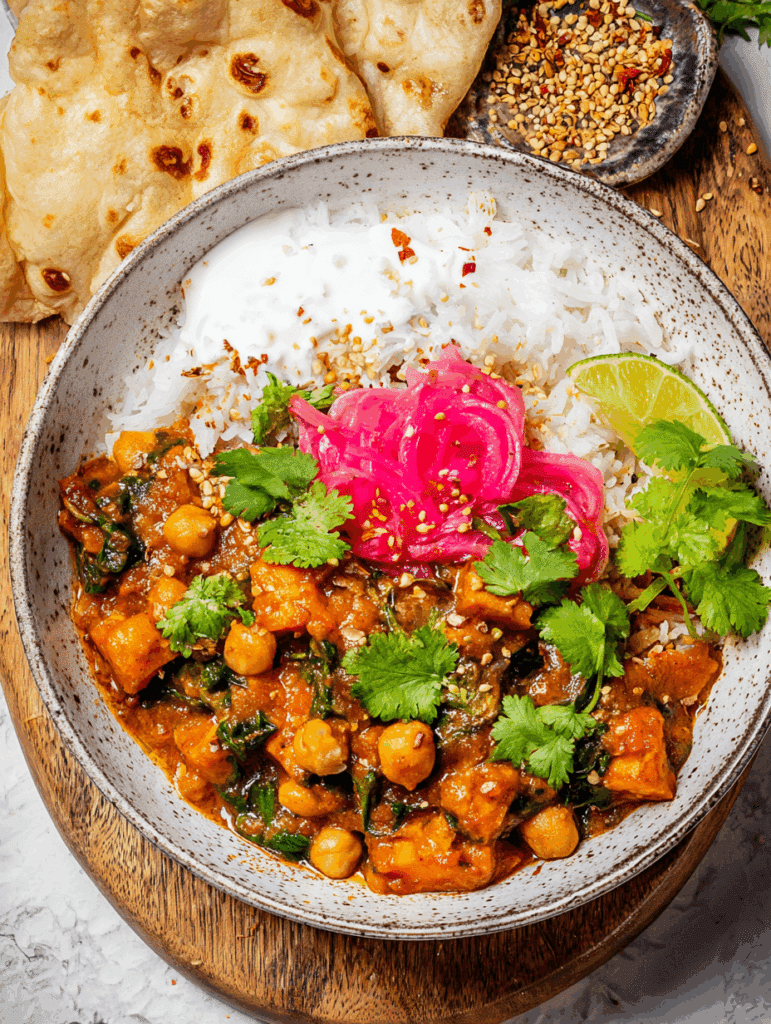 Creamy, fragrant, and protein-rich, this curry blends tender sweet potatoes with chickpeas in a spice-filled sauce. It’s plant-based comfort food at its best, warming, nutrient-dense, and ideal for make-ahead lunches or cozy dinners. Plus, it’s simple enough for weeknights but flavorful enough to impress.
