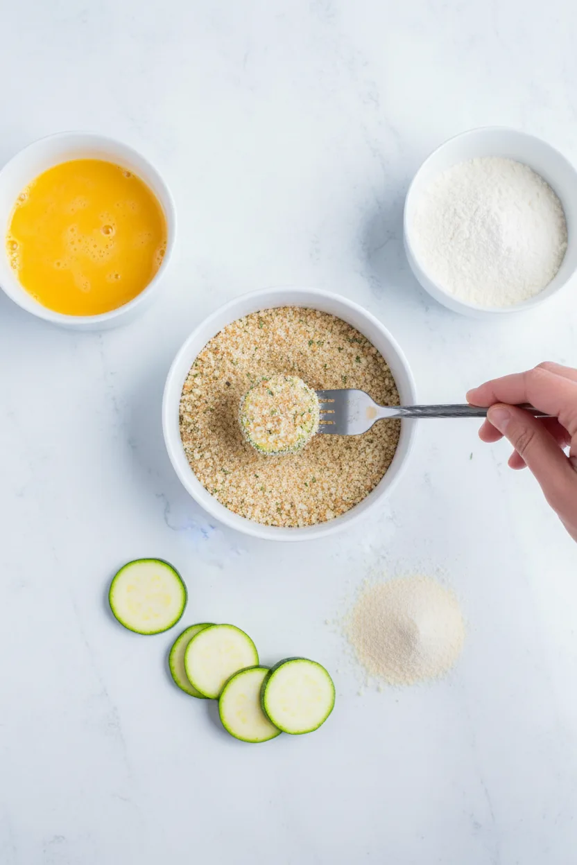Dip zucchini slices first in egg mixture, letting excess drip off. Press firmly into breadcrumb blend to adhere coating.