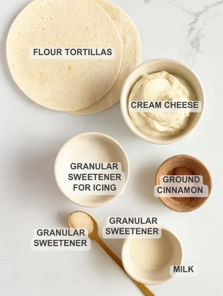 You only need a few simple things: tortillas, a creamy layer, and that cinnamon-sugar sparkle. The result is a flaky edge, a soft middle, and happiness on a plate.