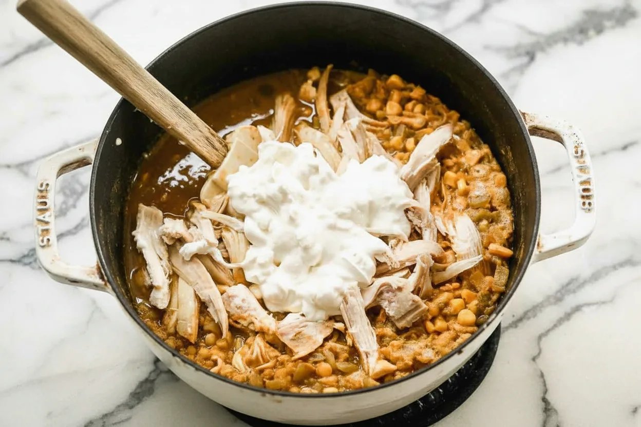 Add both pureed and whole beans to the pot along with corn. Simmer uncovered for 20 minutes to develop flavors. Remove from heat before stirring in shredded chicken and sour cream.